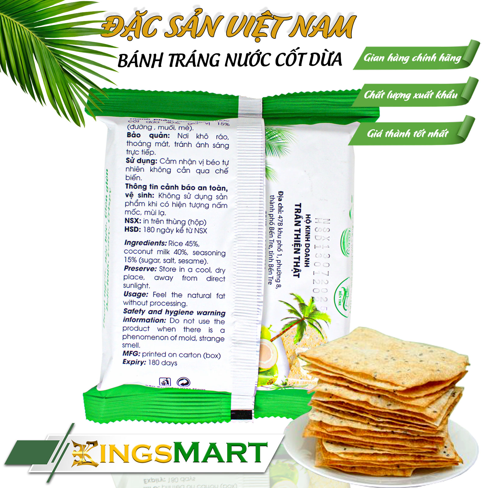 – Nguyên liệu được lựa chọn kỹ lưỡng, hoàn toàn không dùng hóa chất hay chất bảo quản. Bánh được tráng mỏng, phơi hoặc sấy trong môi trường khép kín giúp mặt bánh khô đều, trắng ngà pha vàng nhẹ, giữ trọn hương thơm tự nhiên của nước cốt dừa béo ngậy.