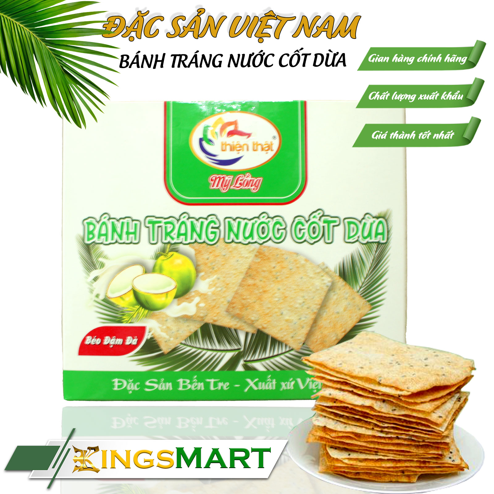 – Bánh tráng nước cốt dừa Thiện Thật – đặc sản nổi tiếng của làng nghề truyền thống Mỹ Lồng (Bến Tre) – được làm từ bột gạo thơm dẻo trộn đều với nước cốt dừa nguyên chất, mè rang, đường và chút muối, tạo nên hương vị béo bùi, ngọt nhẹ thơm đậm đà.