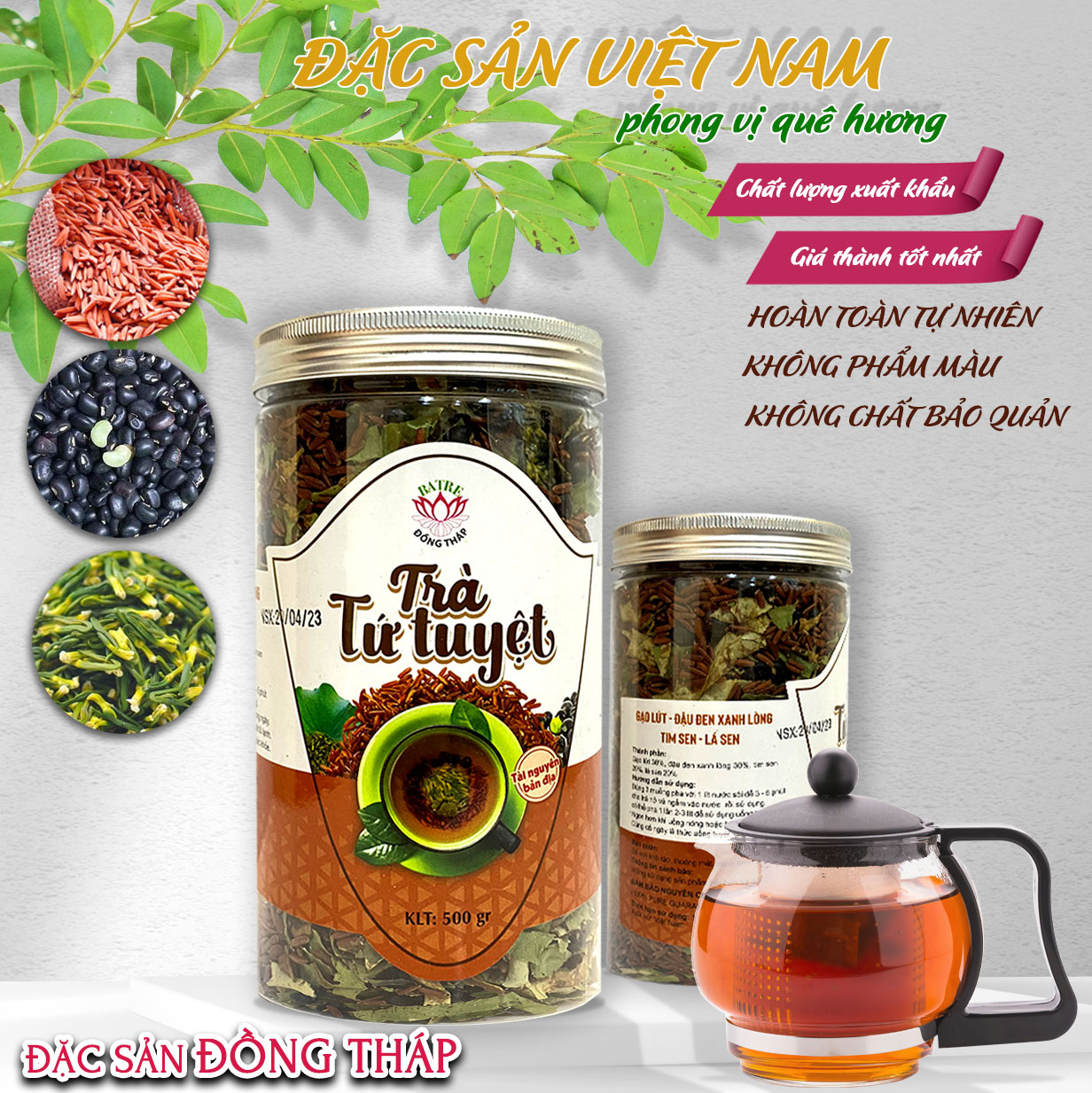 – Trà Tứ Tuyệt được tinh chế từ lá sen, tim sen, gạo lứt, đậu đen xanh lòng, có công dụng thanh lọc cơ thể, an thần, giảm mất ngủ. Nguyên liệu 100% thiên nhiên giúp giữ được trọn vẹn dưỡng chất và mang đến cho người dùng hương vị tuyệt vời.